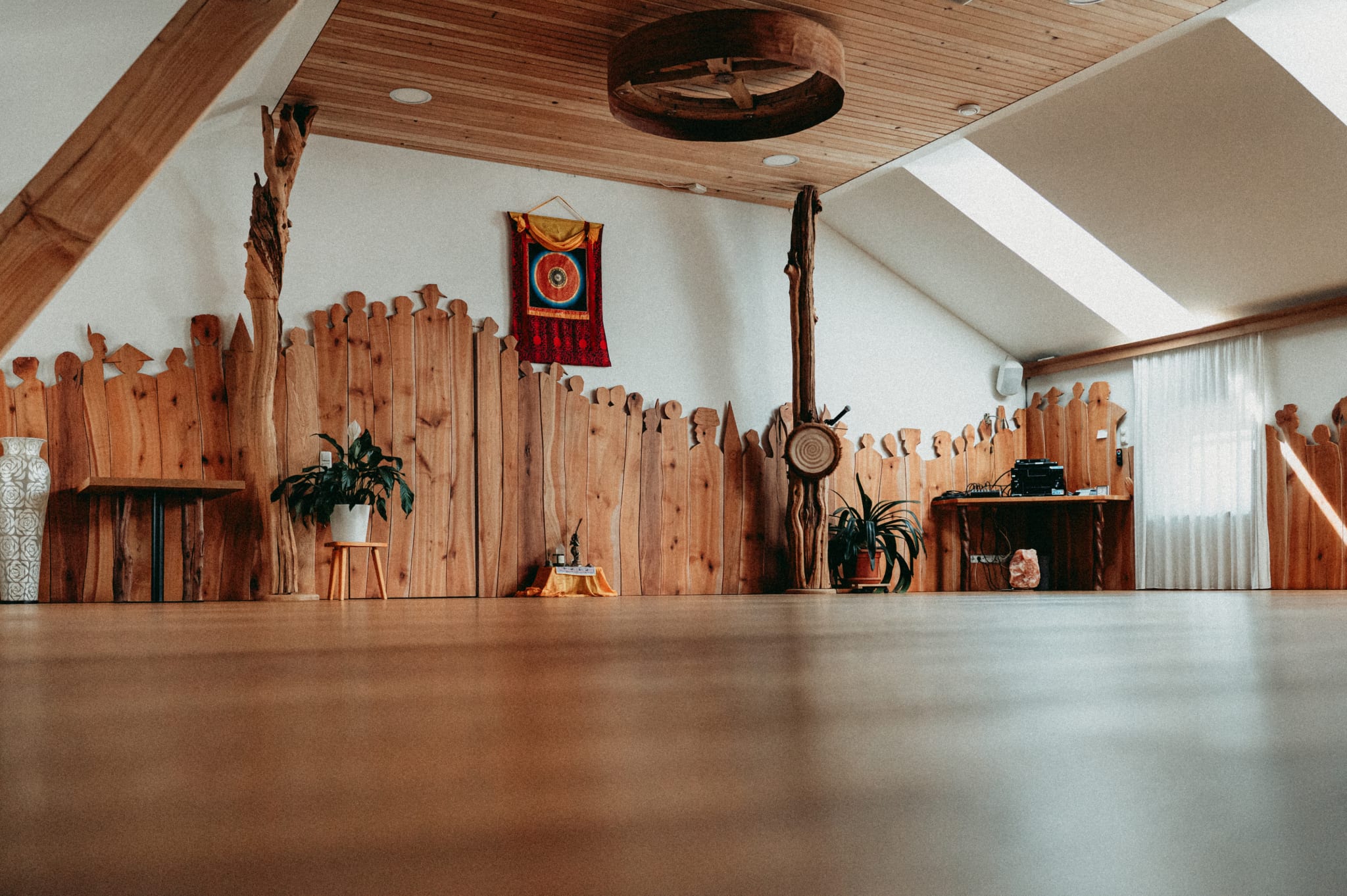 Der Seminarraum erstreckt sich über etwa 100 m2 und versprüht dank der verschiedenen Hölzer aus unserem eigenen Wald eine behagliche Atmosphäre. AETAS bietet Raum für eine Vielzahl von Aktivitäten, darunter Yogakurse, Workshops, Seminare, Meditation, Körperarbeit, Vorträge und deine eigenen Ideen.